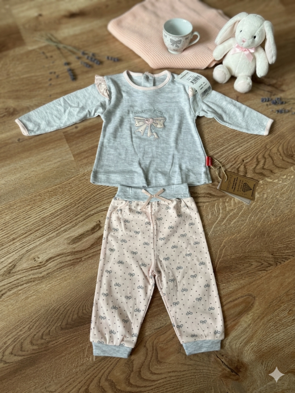 Delikatny model w odcieniu szarości został zaprojektowany z myślą o najmłodszych dziewczynkach. Ozdobna kokardka umieszczona na bluzie nadaje całości subtelnego, dziewczęcego charakteru.