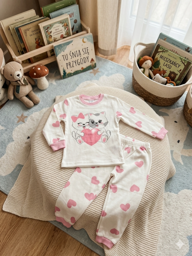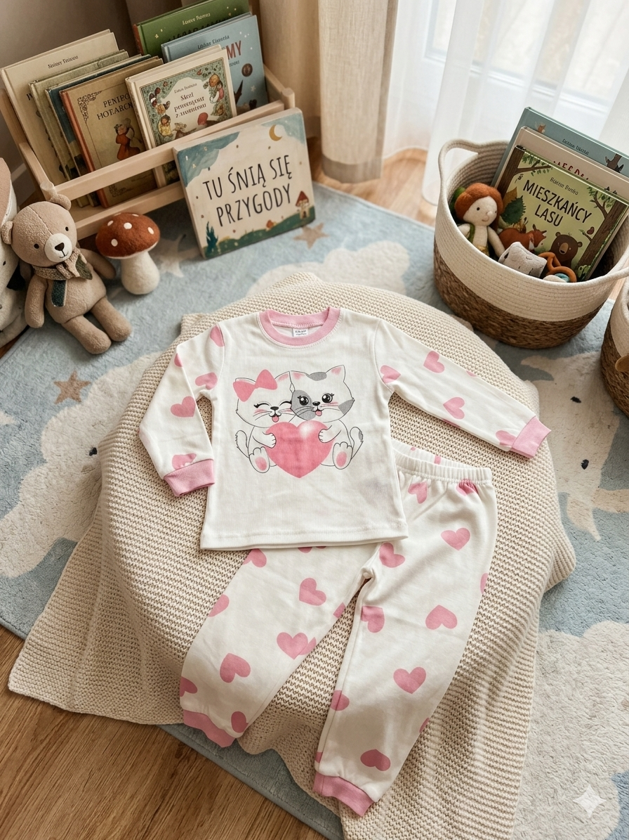 Ten model łączy miękki materiał z uroczym motywem, który przyciąga uwagę od razu. Na bluzie są dwa kotki z serduszkiem pomiędzy nimi. Na spodniach i rękawach pojawiają się drobne serca, dzięki czemu całość wygląda spójnie i lekko.Informacje o dostawie