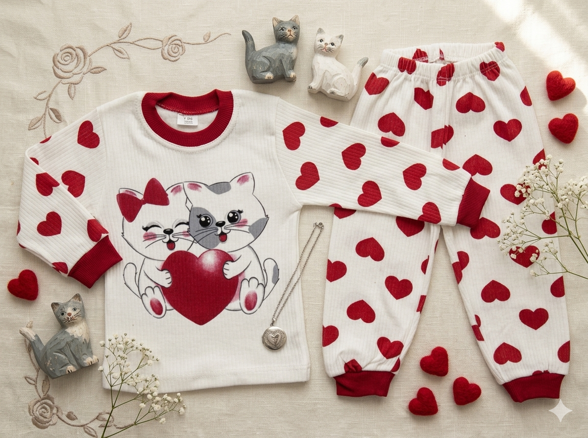 Na bluzie są dwa kotki z serduszkiem pomiędzy nimi. Na spodniach i rękawach pojawiają się drobne serca, dzięki czemu całość wygląda spójnie i lekko.